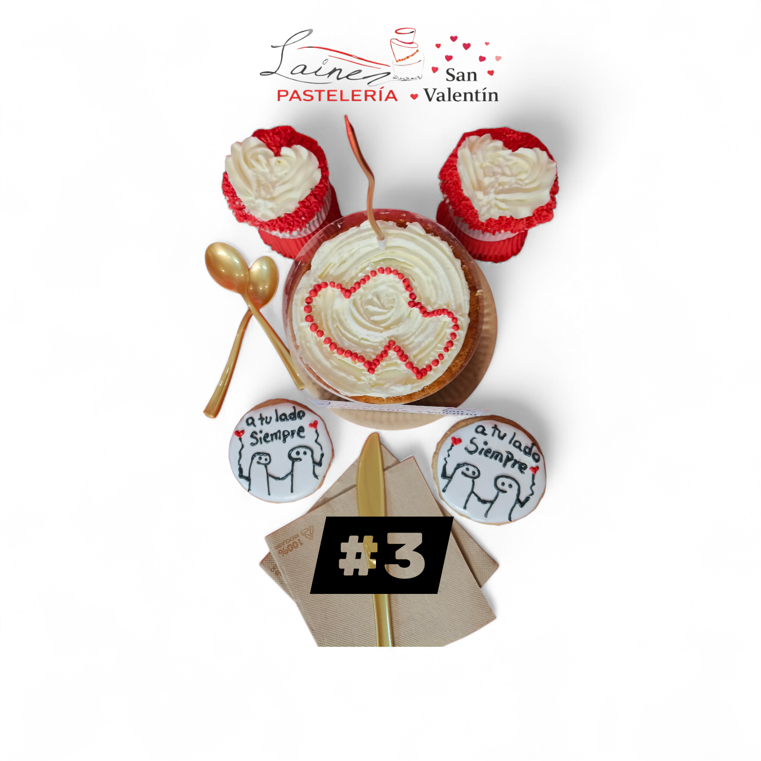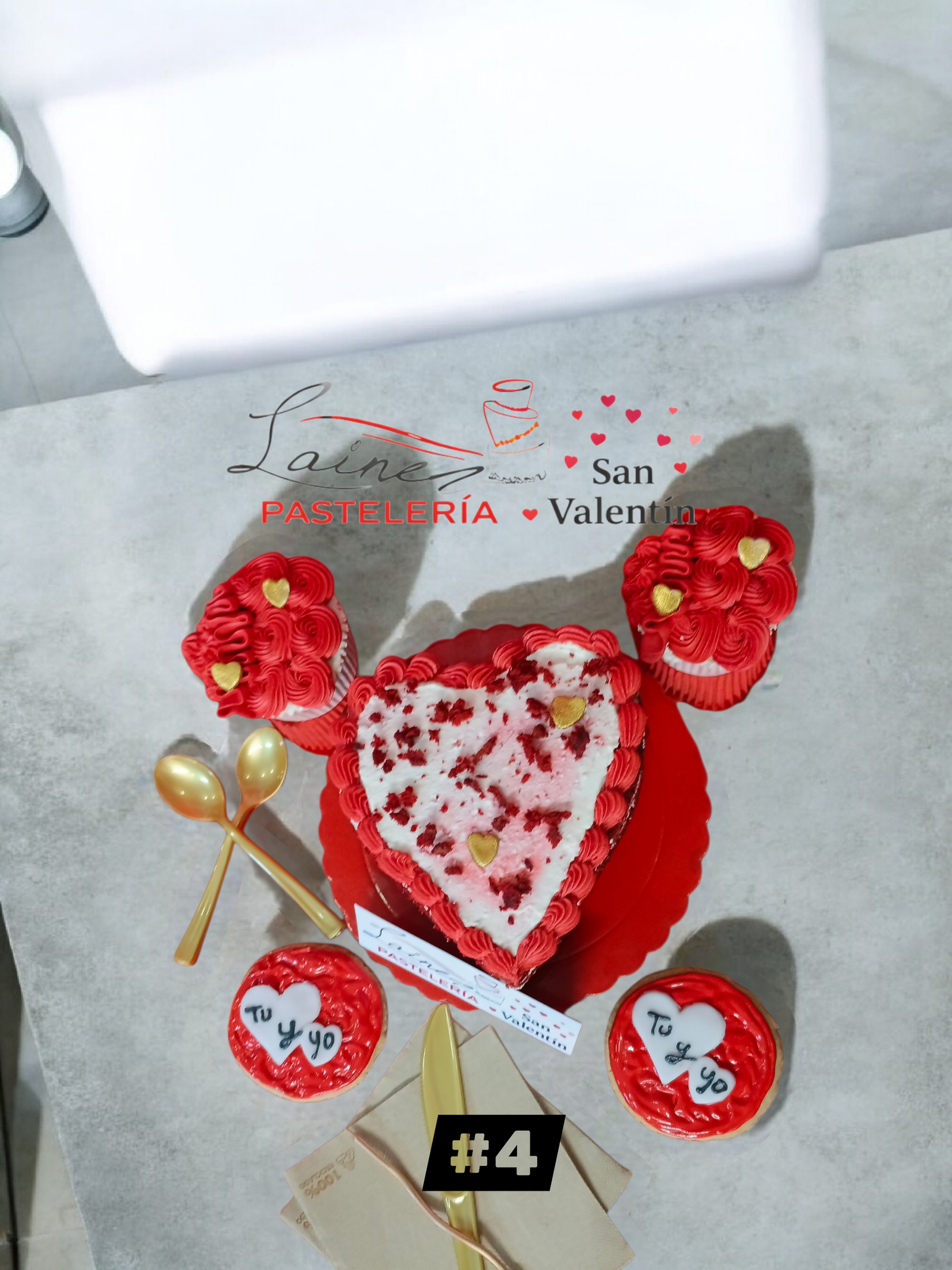 Nuestro pack más intenso y pasional: tarta en forma de corazón con efecto red velvet, cupcakes y galletas con mensaje “Tú y yo”. Un clásico que nunca falla.