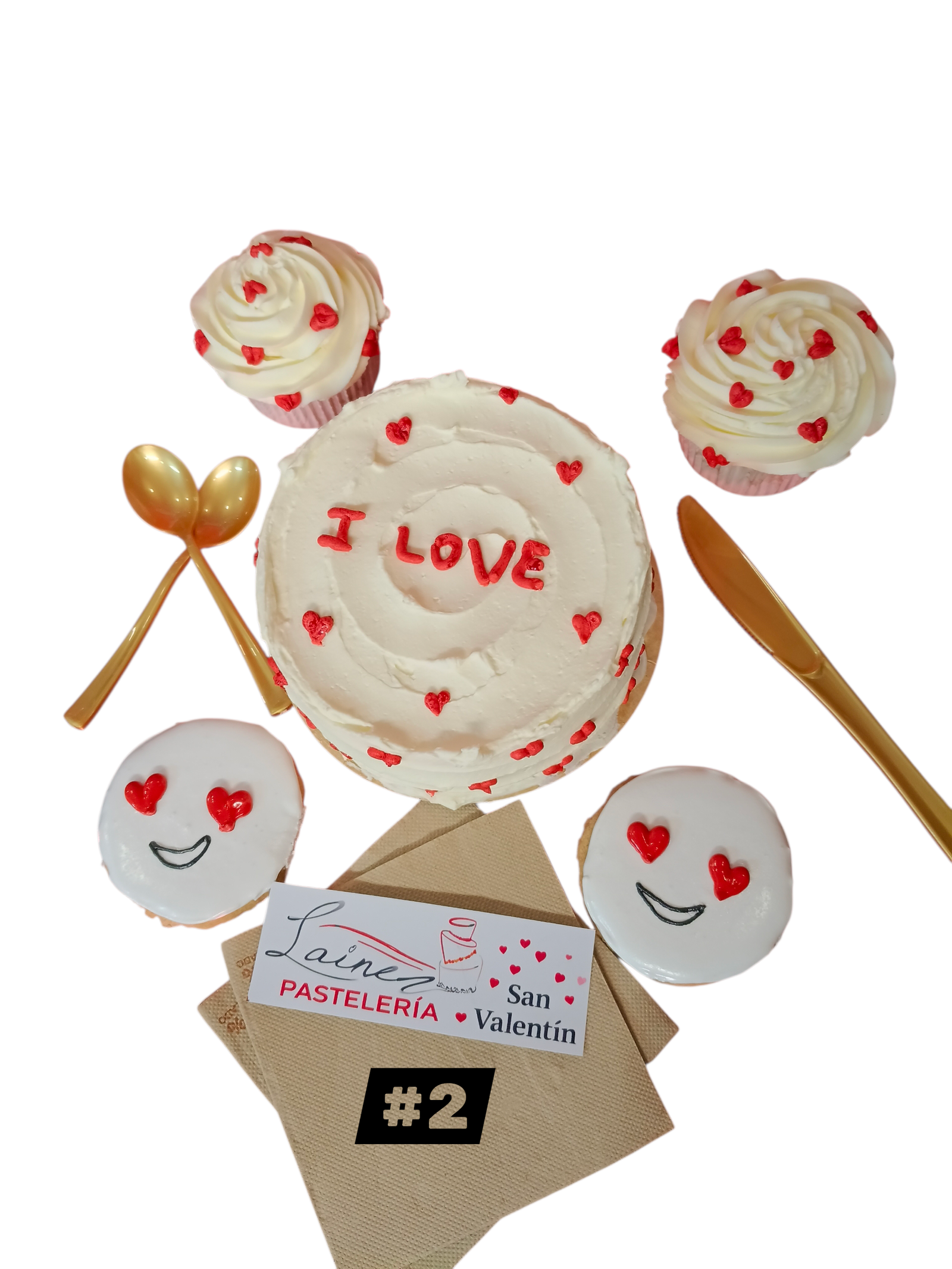 Una combinación dulce y divertida: tarta con mensaje “I LOVE”, cupcakes decorados con corazones y galletas sonrientes. Perfecto para expresar amor de una forma alegre y original.
