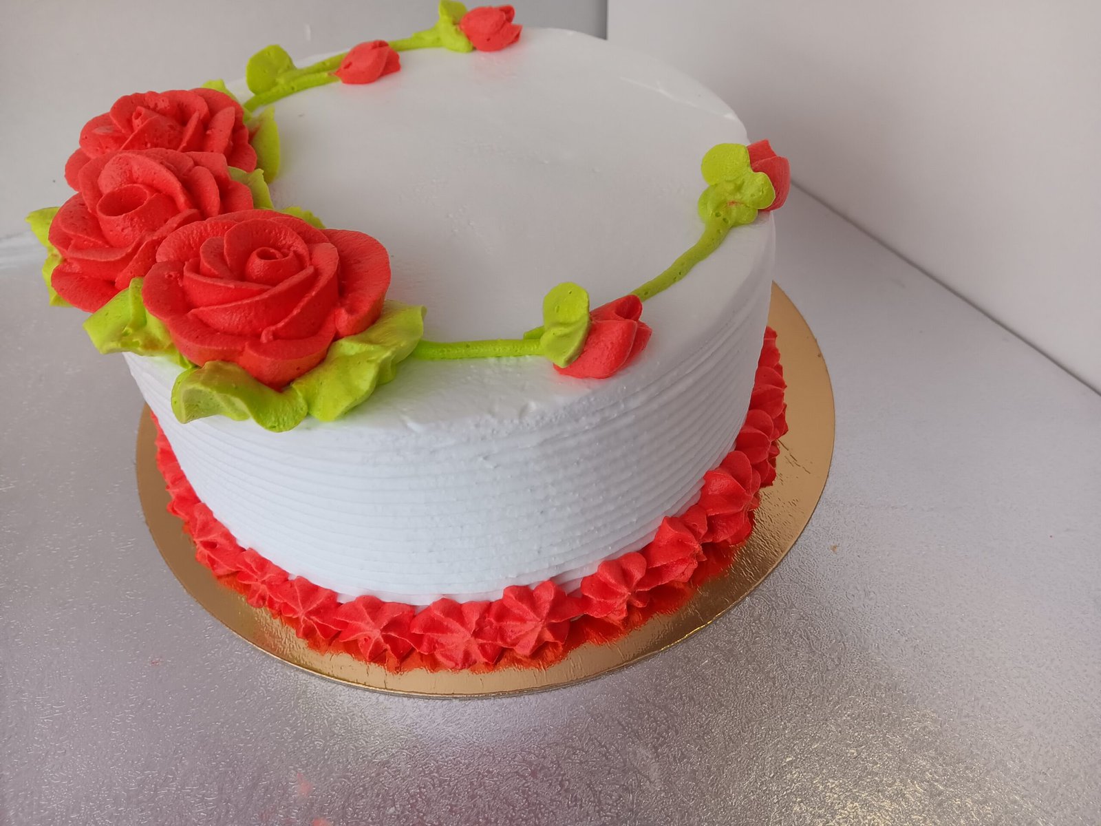 Tarta clásica decorada con merengue artesanal, ideal para celebraciones sencillas y elegantes. Presenta un acabado liso en la parte superior y una decoración en ondas de merengue alrededor del borde superior e inferior, realizada con manga pastelera.
